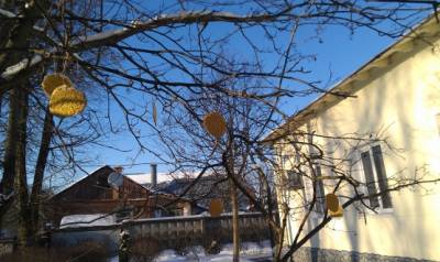 Вывешиваем на улице, привязывая к веточкам деревьев. Если ветер сорвет и унесет - не беда. Кормушка не засоряет природу, так как картон размокает очень быстро, в отличии от пластиковых бутылок и коробок с фольгой.