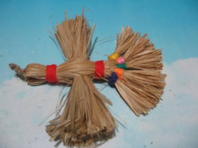Развязать щётку, отделить два пучка травы разной длины (30 и 15 см.) . Середину пучка с длинной травой крепко перевязать коричневой шерстяной ниткой, завязать 7 – 10 узлов. Таким образом, у нас получится «клюв».