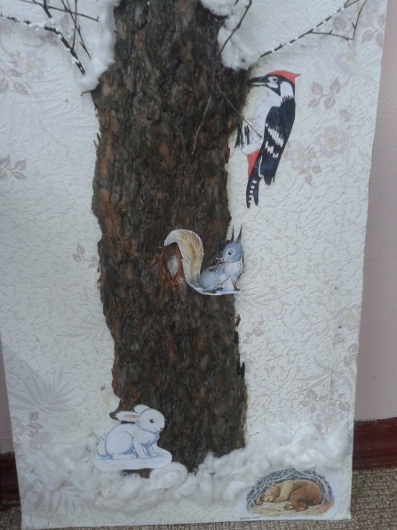 ДВП обклеила обоем, потом приклеила кору и ветки. Ветки украсила пенопластом в виде снега. В низу дерева сделала сугроб из ваты, где спит медведь в берлоге. Возле дерева сидит зайка, а на дереве сделала дупло и посадила белочку. А так же на дереве сидит Дятел и Сова.