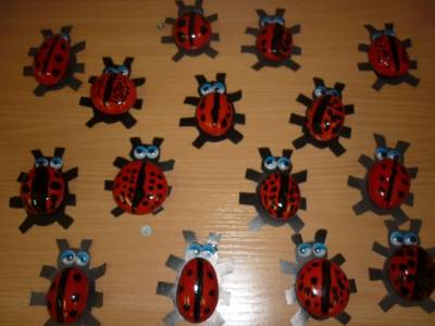 Смотрели мы, смотрели на наши камни, представляли, на кого они могут быть похожи и решили их «оживить». Взяли гуашь, кисточки, клеёночки и покрасили морские камни в красный цвет. Потом дорисовали чёрной гуашью точки и прямую линию вдоль всего камня, получилась спинка божьей коровки. Из черного картона вырезали брюшко с лапками и головой, приклеили на него «оживший» камень, украсили голову божьей коровки глазками и она ожила. Так, в нашей группе появилось целое семейство божьих коровок. Одна другой лучше!