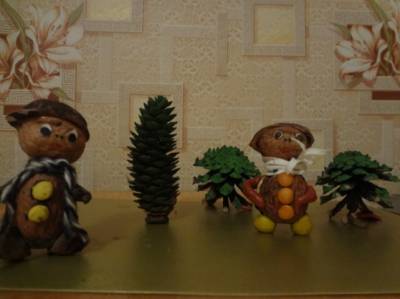 Дети с большой охотой делают игрушки из природного материала. Но особую радость им доставляет работа из шишек и скорлупы грецкого ореха. Привлекательный внешний вид этого материала, совершенство и разнообразие форм и цвета воздействуют на эмоциональную сферу ребенка, вызывает большой интерес к ним. Поделку из шишек и скорлупы грецкого ореха «Чук и Гек на прогулке» выполнила Вельмискина Карина (6 лет) под руководством воспитателя. Для изготовления этой поделки потребовалось: скорлупа грецкого ореха, шишки, пластилин, клей ПВА, цветной картон, ткань, пряжа, ножницы и фломастеры. В процессе изготовления поделки необходимо приучать ребенка к аккуратности.
