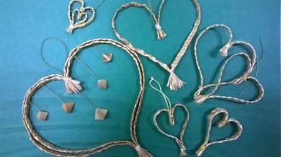 Если взять четыре готовых косички, то получится большое сердечко. С помощью иголки и ниток пришиваем соломенные бусинки для украшения.