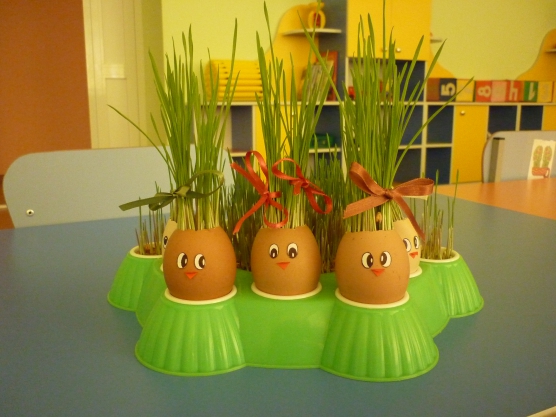В нашем экспериментальном уголке поселилась «Весёлая семейка». А было это так… С детками мы решили проследить за тем, как прорастает пшеница. Зёрна сначала замочили и стали наблюдать, как они разбухают. На третий день пшеница «проклюнулась» и мы поместили её вместе с влажными опилками в яичные скорлупки, а чтобы заинтересовать ребятишек я сказала, что когда вырастут зелёные росточки, у яичек откроются глазки и вырастут клювики. Ребятки с нетерпением стали ждать этого дня, каждый раз заглядывая на полку, где стояли скорлупки.
