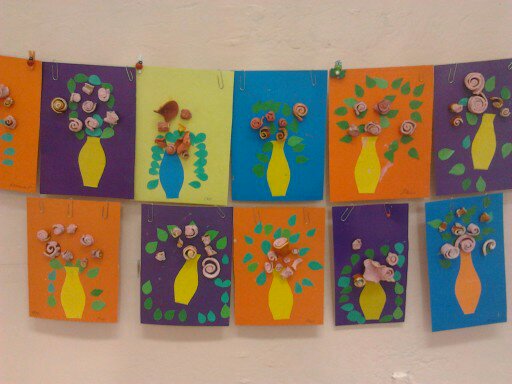 Заготовки розочки разукрашиваем гуашью. Пока розы подсыхают, наклеиваем на цветной картон вазу и листочки.