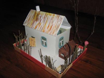 коробку. Из веточек сделали плетень, закрепили ее с помощью пластилина.
