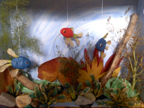 Осень-самая благодатная пора для поделок из природного материала. вот и мы решили пофантазировать с ребятами и сделать коллективную работу "Аквариум". Мне пришла в голову идея сделать поделку в небольшой коробке из под обуви, для того, чтобы работа получилась объемной, ну а гуляя на участке во время прогулки мы с детьми собирали различные камушки, веточки, листья. даже виноградные веточки пошли в дело имитируя водоросли, так же нам понадобились: клей-карандаш, акварельные краски (для фона, немного пластилина (для туловища у рыбок. а так же для дна аквариума, сушеный горох (можно гречу или пшено, ни и немного ниток (для подвешивания рыбок) ну и немного фантазии. Дети были в восторге от проделанной работы, получилось очень оригинально и красиво.