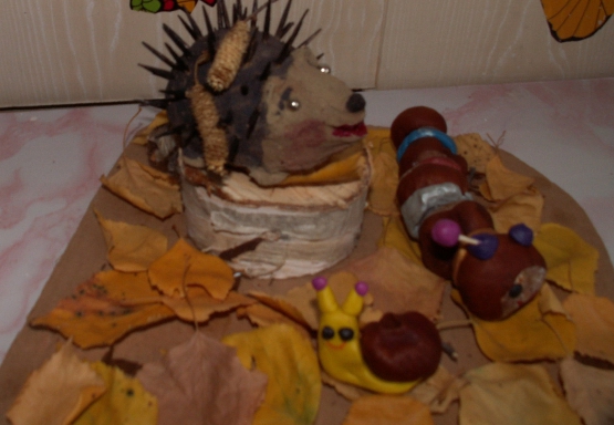 Каждый год в нашем детском саду проводится выставка работ из природного материала. Мои воспитанники -это дети подготовительной группы. Они с удовольствием приняли участие в проведении этого мероприятия и конечно не отказались от помощи своих родителей. Важная часть этой выставки- это использовать в своих работах дары осени: шишки, желуди, сухие листья, ягоды. Дети с радостью приносили свои поделки, делились впечатлениями, где собирали природный материал, как делали работу. Простые шишки превращались в ежей, а орехи каштана в таких прекрасных гусеничек.