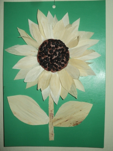 Есть у меня «Волшебный сундучок». Это такая, довольно вместительная коробка из под обуви с крышкой, оклеенная самоклейкой и украшенная цветочками. Ничего особенного, но для работы удобно. Каждый раз, выходя на прогулку с детьми, я беру её с собой. Туда кладу всё, что мне может пригодиться на улице, чтобы лишний раз не возвращаться в группу. Дети, каждый раз с интересом на неё посматривают, какой сюрприз, в очередной раз там может находиться. Вот и сегодня положила туда листья талаша, клей пластилин ножницы, лист картона и конечно же фотоаппарат. С ним последнее время стараюсь не расставаться. Вышли на прогулку, а дети не спешат от меня уходить и интерес в их глазках разгорается больше и больше. Конечно же открываю коробку, достаю всё, что там лежит. Детям интересно, что же мы будем сегодня делать. Предлагаю детям сделать сегодня «Подсолнух» из листьев кукурузного початка или талаша.
