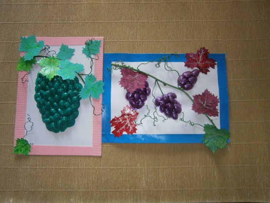 После того, как выложили из скорлупок виноград, можно приступать к раскрашиванию. Раскрашивать нужно так, чтобы не высвечивало нераскрашенных скорлупок.